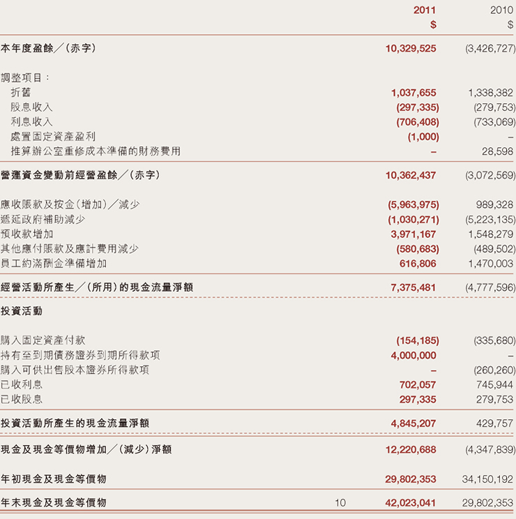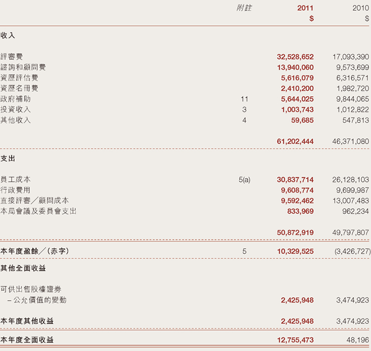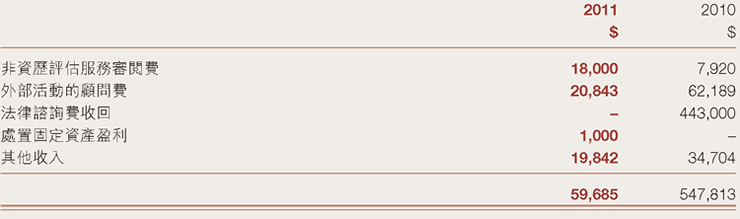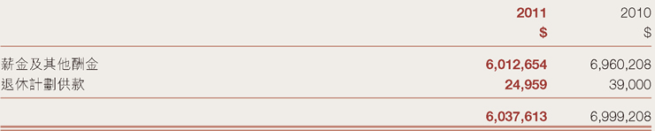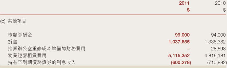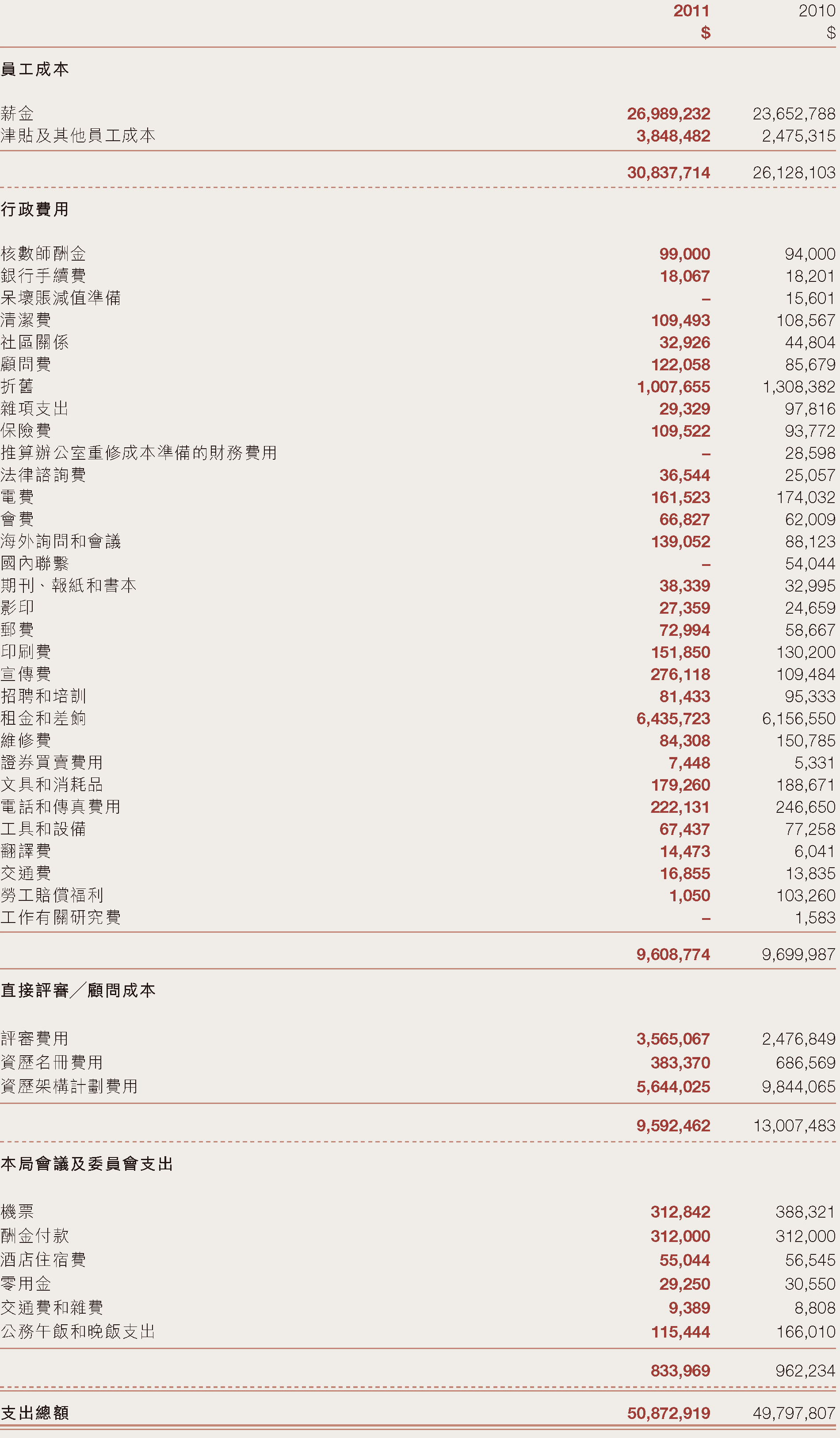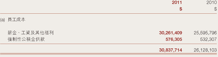 以上員工成本並不包括薪金、工資和其他福利共4,575,483元(2010年:7,663,812元)以及強制性公積金供款124,429元(2010年:132,161元),而這些都是資歷架構計劃相關的金額,並計入全面收益表中「直接評審/顧問成本」一項。