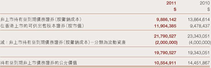 於二零一一年三月三十一日,本局以公允價值列賬的金融工具為於香港聯合交易所上市的可供出售股本證券其市場公允價值為11,904,385元(2010: