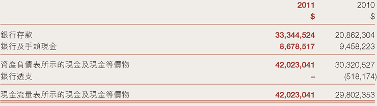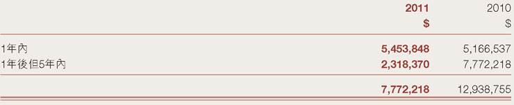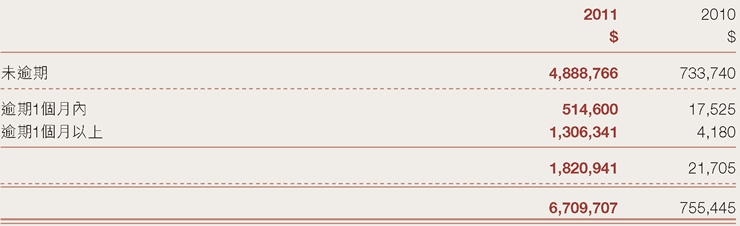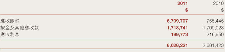 除1,670,371元(2010年:1,672,171元)的租金及水電費按金外,所有應收賬款及按金被視為可在1年內悉數收回。