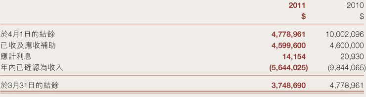 當可以合理確定本局將會收到政府補助並會履行該補助的附帶條件時,便會初次在資產負債表將政府補助確認為遞延收入。用於彌補本局已產生支出的補助,會在支出產生的期間有系統地在盈餘或赤字中確認為收入;