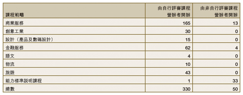 市場對非本地課程的評核服務需求殷切。本報告期內經評核的非本地課程達500個(包括40項新註冊申請、337項週年申報表及123項改動的申請),整體數字較去年同期上升38%。有關週年申報表及改動的評核申請分別上升了43%和64%。新課程註冊申請共40項,下降了21%,共分類如下: