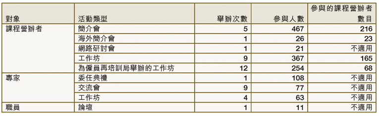 評審局在報告期內共舉辦了43場不同形式的聚會和培訓活動(見表一)。出席者意見調查顯示,評審局的培訓服務乃優質和具成效。