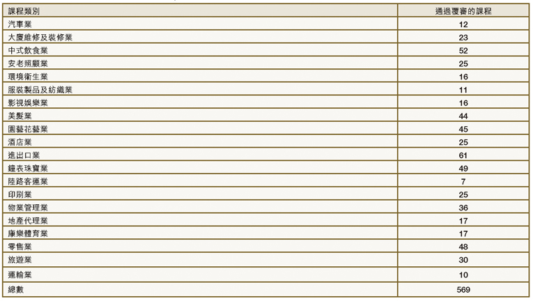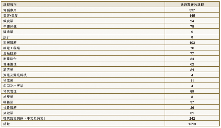 為確保已上載到資歷名冊之課程繼續符合資歷架構的標準,評審局為167個「技能提升計劃」課程完成了複核確認,這些課程涵蓋的行業包括有酒店、影視娛樂、旅遊、零售、地產代理、園藝花藝、大廈維修、中式餐飲、汽車和環境衛生。年內,評審局亦為1,140個「人才發展計劃」課程完成了複核確認,這些課程範圍涵蓋電腦應用技術、印刷及出版、設計、商業、地產、旅遊、健康護理、美容及美髮、物流、建造、家居服務、物業管理、資訊及通訊科技和社會服務。此外,569個「技能提升計劃」課程及1,519個「人才發展計劃」課程亦成功通過覆審,有效期為三至四年。