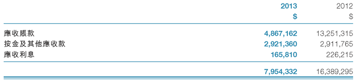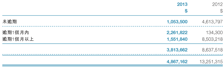 除13,600元(2012年:1,670,371元)的租金及水電費按金外,所有應收賬款和其他應收款被視為可在1年內悉數收回。